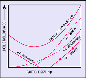 Due to its own gravity that approaches to the fiber from the airflow, particle exits from the air current and is settled and compacted. This effect occurs when the particle size is large and the filtration speed is slow. |