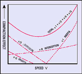 | Although the particles overlapped with these effects are compacted on the filter fiber, the change by the respective effective particle size and speed may be shown in the lower left diagram. The actual filter compaction efficiency has the trend in the lower right diagram. |